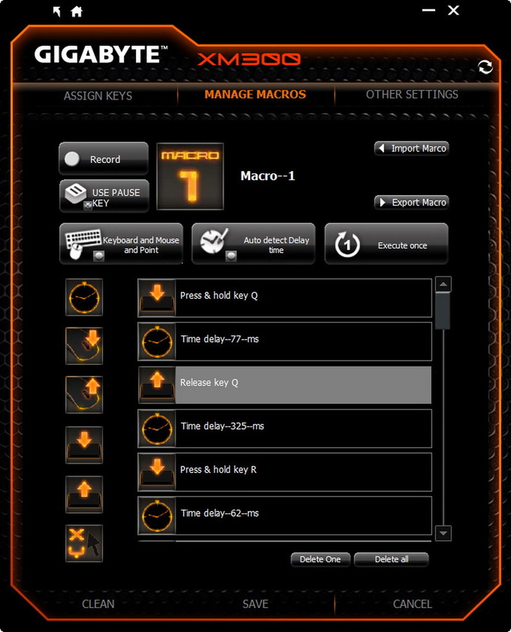 再來第二項則是MANAGE MACROS,也就是自訂義巨集功能,高達50組可自編輯定義鍵盤滑鼠巨集,對!你沒看錯,連鍵盤的按鍵也可以!!它根本就是一個鍵鼠記錄精靈,你可以錄下滑鼠移到某XY軸點下左鍵,按下QWER按鍵等,錄好後再單獨調整刪除可能按錯的步驟,然後可以輸出或載入設定的巨集檔!
