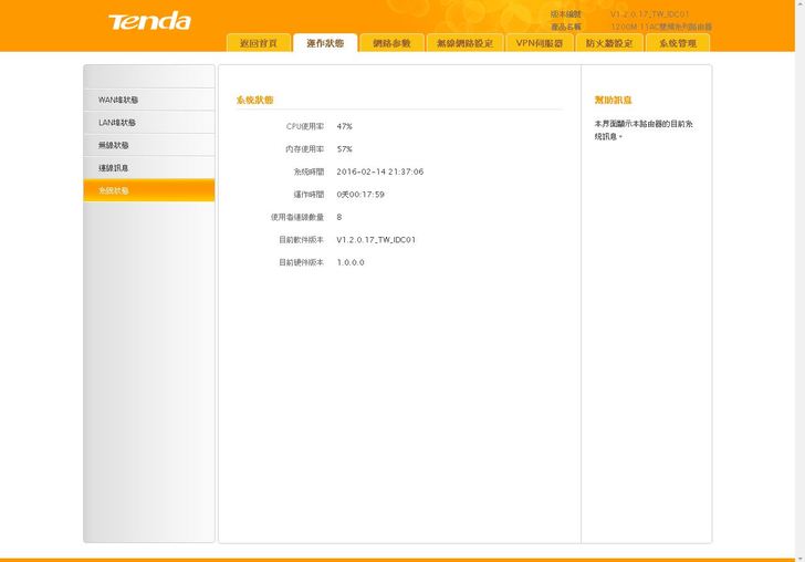 狀態有五大類資訊顯示,都是基本資訊就不一一貼圖了,分別是WAN對外的狀態,以及對內的LAN跟無線,再來就是目前連線情形跟系統的資訊,比較特別的是在這入門價位的AP裡面,他有提供可以看到現在系統覆載的情形,但是好像也不能做什麼XD