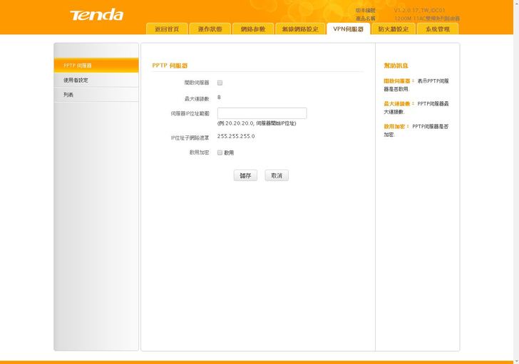 Tenda FH1208還有一個主打得功能就是內建可以作為VPN SERVER,可以同時8個連線,對於常去大陸的人或是上班公司網路擋很多的人,可以說是一大福音吧XD,像我自己都是用電腦或是NSA當作VPN SERVER,在安全性方面就多一分顧慮,而且電腦的話還必須一直開著,如果AP可以直接做掉這功能的話就省去很多麻煩了。