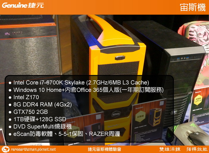 ▲宙斯機的規格,在內部規格上配置了Intel Core i7-6700K的CPU、Z170的晶片組、8G DDR4 RAM、GTX950獨立顯卡、1TB硬碟加上128G SSD。整體上是以黑橘兩色的搭配來設計機殼,造型上還OK,只能說內在美好是比較重要啦。