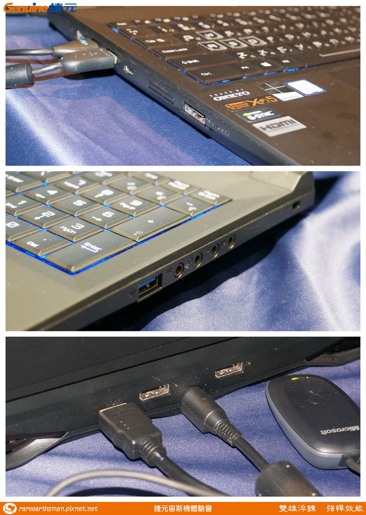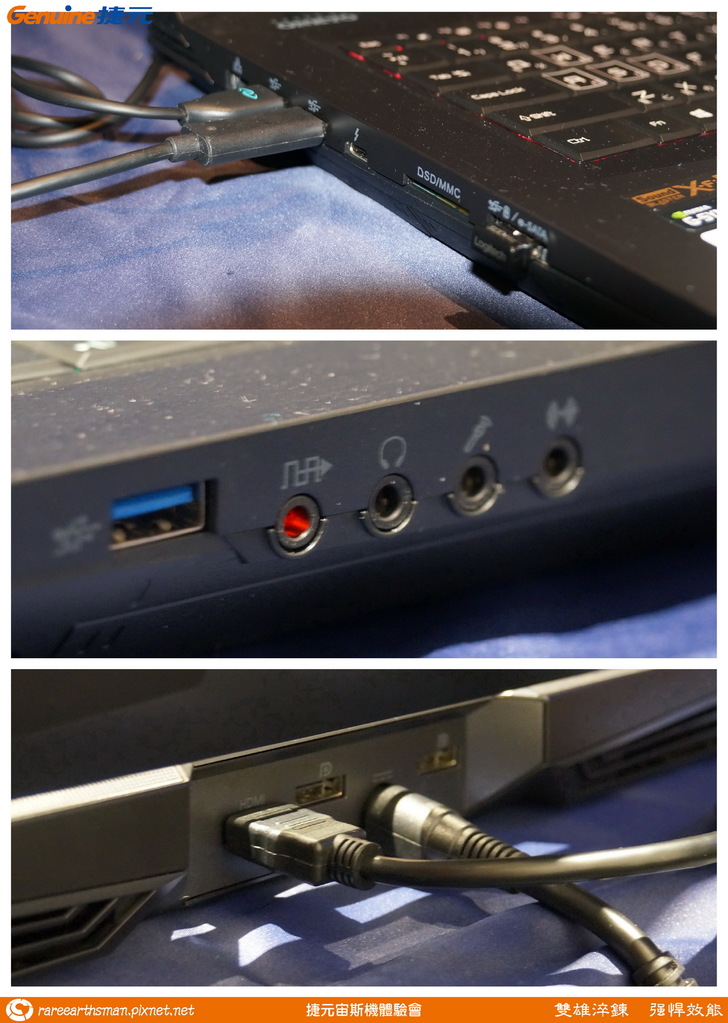 ▲ZEUS15的連接埠是跟ZEUS17是完全相同的,左側有RJ45、USB3.0x2、Thouderbolt、8合1讀卡機、USB3.0與e-SATA複合連接埠;右側則有USB3.0、耳機孔、麥克風孔、音源輸入孔;後方有Display Port x2、HDMI及電源孔。