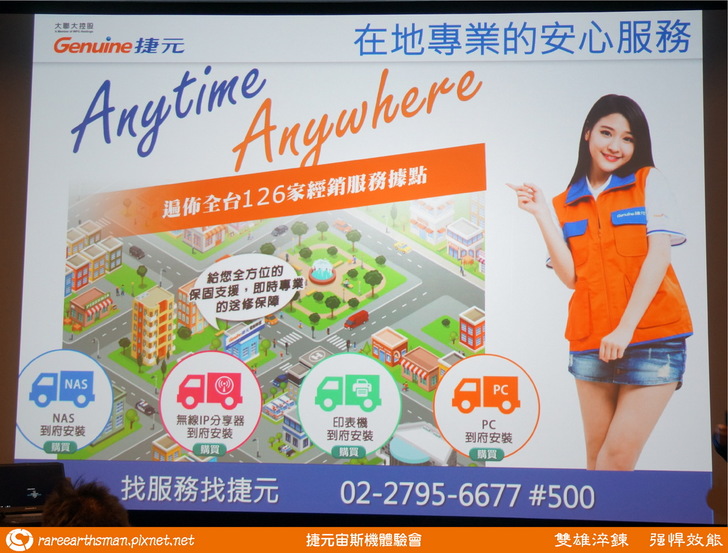 ▲第二項在地的專業服務方面,產品如果發生問題,捷元有兩種方式尋求協助,除了可以撥打捷元的服務專線,另外全台有126家的授權的服務中心。另外捷元也有到府服務的部分,例如PC、印表機、NAS及無線IP分享器,特別是NAS及無線IP分享器這兩項需要稍微複雜的設定需求,一般人安裝比較有問題,捷元的到府系統就會提供完整的安裝服務。