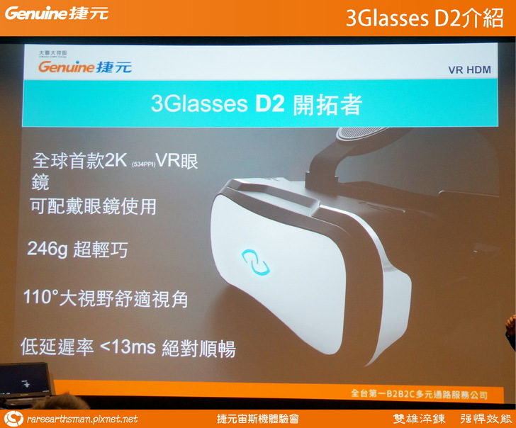 ▲這款3Glasses D2的VR是市面上開始量產販售的商品,是全球首款搭載了2K解析度的頭戴式顯示器,使用時可以配戴眼鏡來使用,重量只有264g,110度的可視角度與小於13ms延遲率。