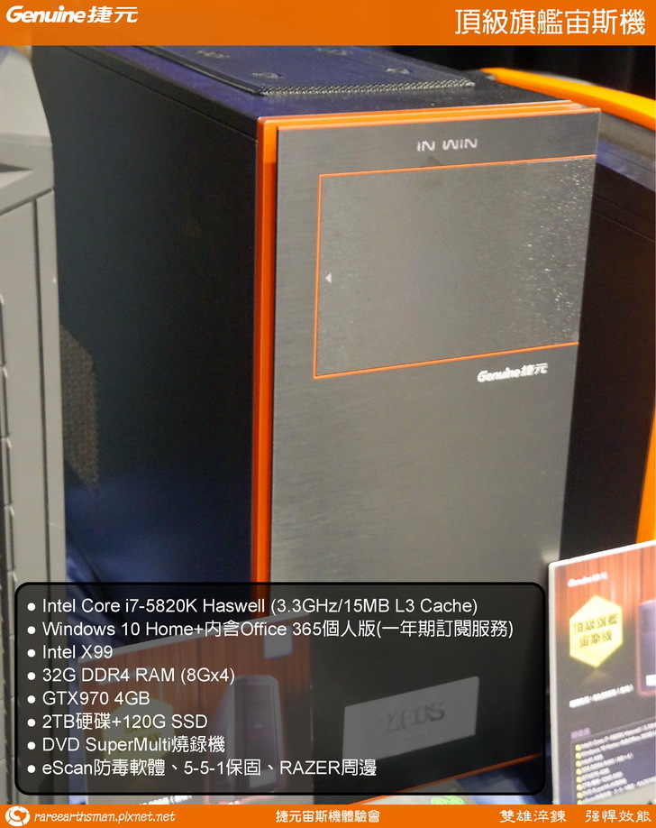 ▲頂級旗艦宙斯機的規格,因為擴充性的關係,通常頂極或旗艦的機種體積都滿大的,而且散熱效果都不錯;在內部規格上配置了Intel Core i7-5820的CPU、X99的晶片組、32G DDR4 RAM、GTX970獨立顯卡、2TB硬碟加上120G SSD,規格滿漂亮的。