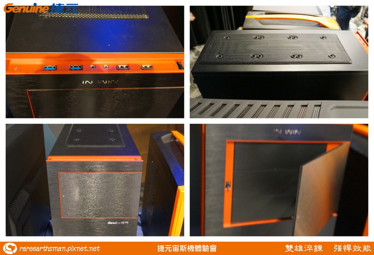 ▲這款頂級旗艦宙斯機的機殼部份是IN WIN的機殼,配置了3個5.25" Bay,且外觀設計了一個門,讓電腦機殼的外觀更為簡潔;前方塑膠面板的左右下方都設計了進氣孔,機上的上方也設計了大片的散熱孔,看起來這台的散熱效果應該會不錯;前方的連接埠設計在面板的上方,是朝上的,共有USB3.0 x2、USB2.0 x2、Audio x1、Microphone x1。