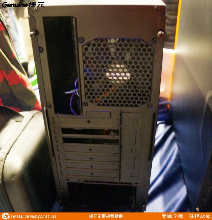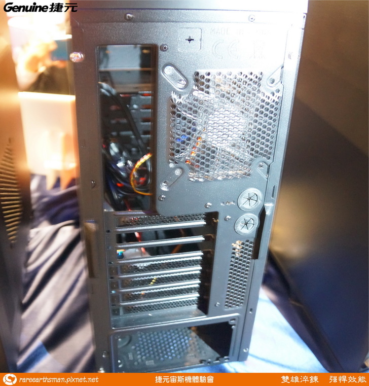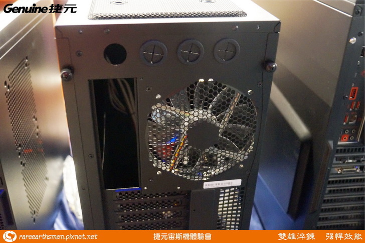 ▲機殼後方,機殼兩側側板都是使用手轉螺絲固定,看起來兩側都是可以打開的,後方配置了一顆大風扇之外,上方也設計了4個水冷散熱的預留出孔,頂級旗艦宙斯機除了基本的規格是風冷的系統外,也可以進階DIY成水冷的散熱。