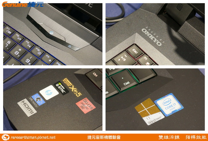 ▲ZEUS17筆電鍵盤上方是電源按鍵,鍵盤周圍有許多內附功能的貼紙與印刷,包括左上方有標示音源輸出使用ONKYO,左下方貼著Sound Blaster X-FI高傳真音效、Killer網路、Thouderbolt、VR、HDMI貼紙,以及右下角Intel Core i7處理器與Windows 10貼紙。