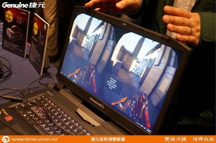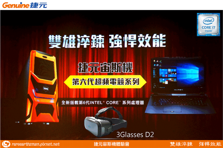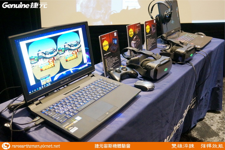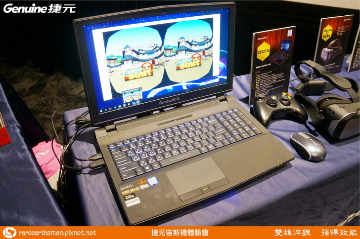 ▲另一側的展示桌上放的是兩款筆記型電競Notebook,型號分別是ZEUS17ZEUS15,兩者螢幕尺寸不一樣,都可以玩高階的電腦遊戲,也都具有容易移動的便利性。捷元電腦除了有自家品牌之外其實也有代理其他的品牌在自家購物平台來販售,展示桌上也放置了兩台VR虛擬顯示器供現場試用,3Glasses D2也是捷元販售筆電宙斯機的贈品之一。