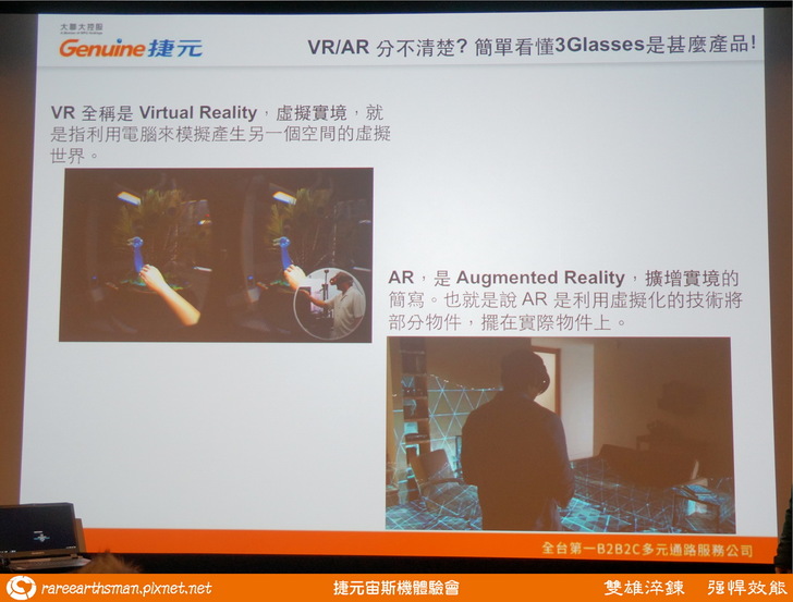 ▲如何區別VR與AR,簡單的說VR虛擬實境就是螢幕裡面所有看見的影像都是虛擬出來的,但是AR擴增實境是指螢幕裡面看見的所以現實景象中出現的一個虛擬物件,兩者都是3D影像方式,只是VR是全影像的3D運算,所以難度比較高,硬體規格要求也比較高。