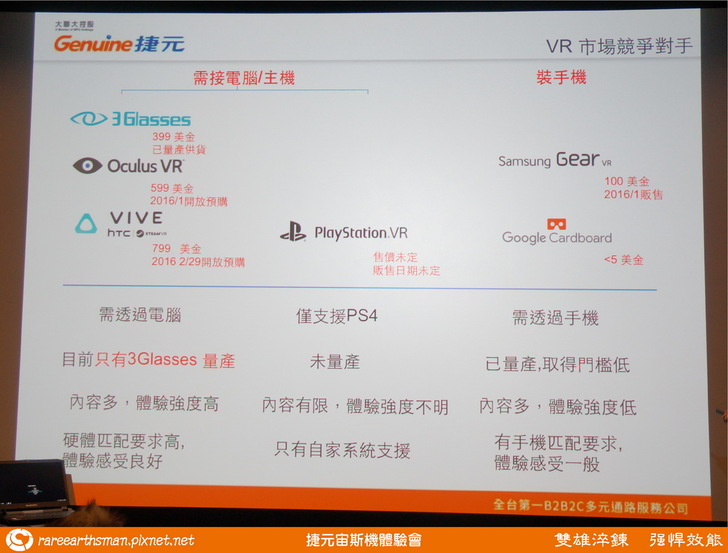 ▲現有VR產品功能分類,主要是以是否需要連接主機來分類,像三星的Gear與Google Cardboard的螢幕是靠手機來顯示,所以它就沒有連接線拉出來,好處是自由度很高,不會被連接線所牽制住,但是缺點就是遊戲或3D效果比較差一點;另一方面的產品像是3Glasses D2、Oculus VR、htc VIVE、PlayStation VR這類需要連接線接主機的類型,遊戲體驗效果就好很多,缺點是那條線,所以這兩種類型在現階段各有其優缺點。