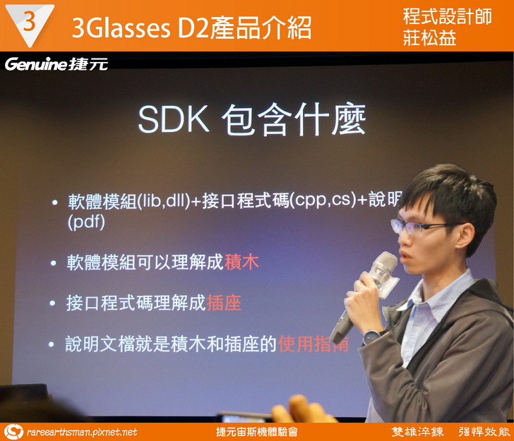 ▲3Glasses D2由軟體研發部的David來做介紹;首先先介紹提供給開發者的3Glasses SDK裡面包含哪些東西,內含軟體模組、接口程式碼及說明文檔。