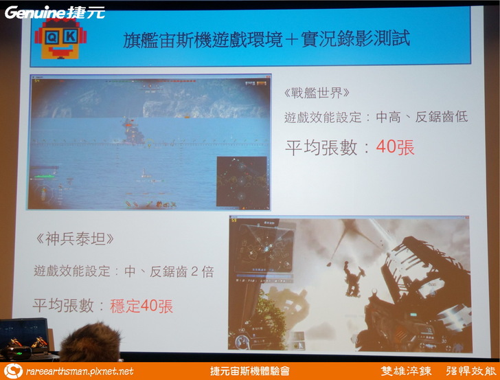 ▲QK使用旗艦宙斯機來體驗最近很夯的戰艦世界與神兵泰坦這兩款遊戲,兩組遊戲在宙斯機強大的效能之下都可以維持每秒平均40幀率以上的表現,算是表現很好很穩定的表現,特別是QK用宙斯機來玩遊戲的同時還需要同時錄影、剪輯影片及上傳影片,CPU及顯卡的效能都跑到70%左右,這些高運算的工作同時運作需要非常好的電腦效能才能勝任的,這種狀況遊戲還有40幀率以上的表現。