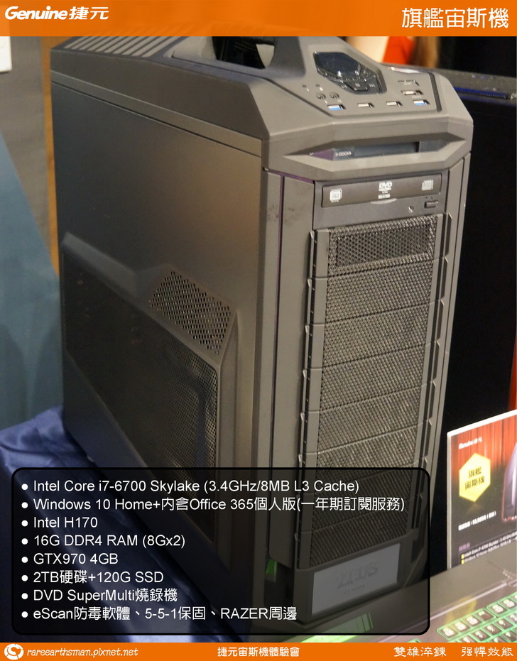 ▲旗艦宙斯機的規格,在內部規格上配置了Intel Core i7-6700的CPU、H170的晶片組、16G DDR4 RAM、GTX970獨立顯卡、2TB硬碟加上120G SSD。外觀上也比較有造型一點,有點粗曠的機械感,除了預裝的DVD佔用一個5.25"Bay之外,尚未使用的其他8個5.25"蓋板外觀都使用鐵網,加上機殼側面及上方把手的散熱孔的組合下,大量的風可以從前方往內部吹,CPU上方的熱會直接背風扇從側板給帶出來,當然內部產生的其他熱源就自然的往上從把手處散熱出去,看來散熱效果應該不錯。