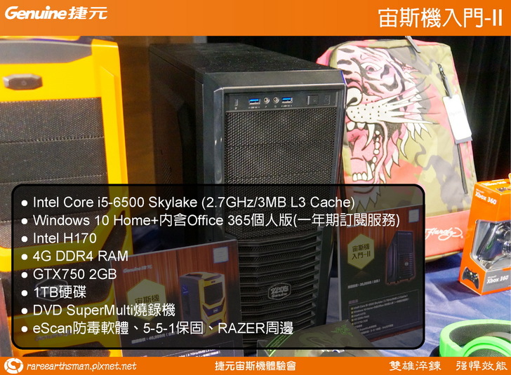 ▲入門級宙斯機的規格,在內部規格上配置了Intel Core i5-6500K的CPU、H170的晶片組、4G DDR4 RAM、GTX750獨立顯卡、1TB硬碟。