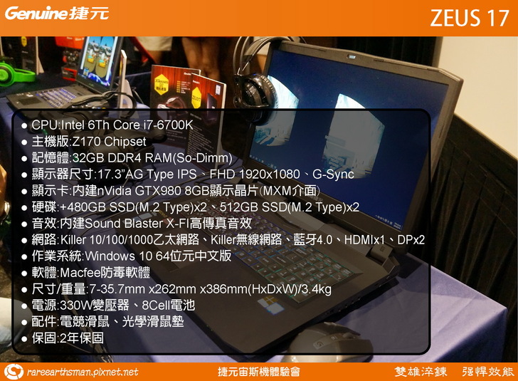 ▲ZEUS17筆電的規格;內部規格上配置了Intel 6Th Core i7-6700K的CPU、Z170的晶片組、32G DDR4 RAM、GTX980獨立顯卡、480GB SSD+512GB SSD硬碟(均是M.2 Type);另外特別的是配置了17.3" AG IPS,解析度1920x1080,加上G-Sync,以及Killer無線網路。