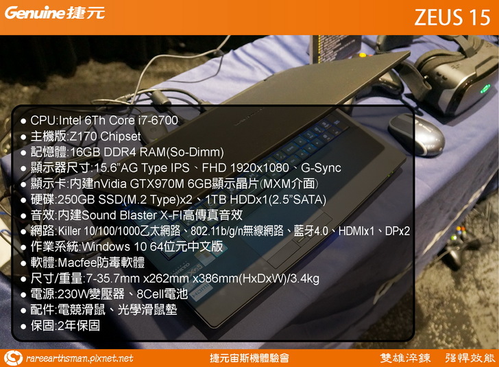 ▲ZEUS15筆電的規格;內部規格上配置了Intel 6Th Core i7-6700的CPU、Z170的晶片組、16G DDR4 RAM、GTX970獨立顯卡、250GB SSD(M.2 Type)+1T硬碟;另外是配置了15.6" AG IPS,解析度1920x1080,加上G-Sync。螢幕尺寸比ZEUS17小了一點,但是整體尺寸都是一樣的,差異只有在重量上差了0.5Kg。