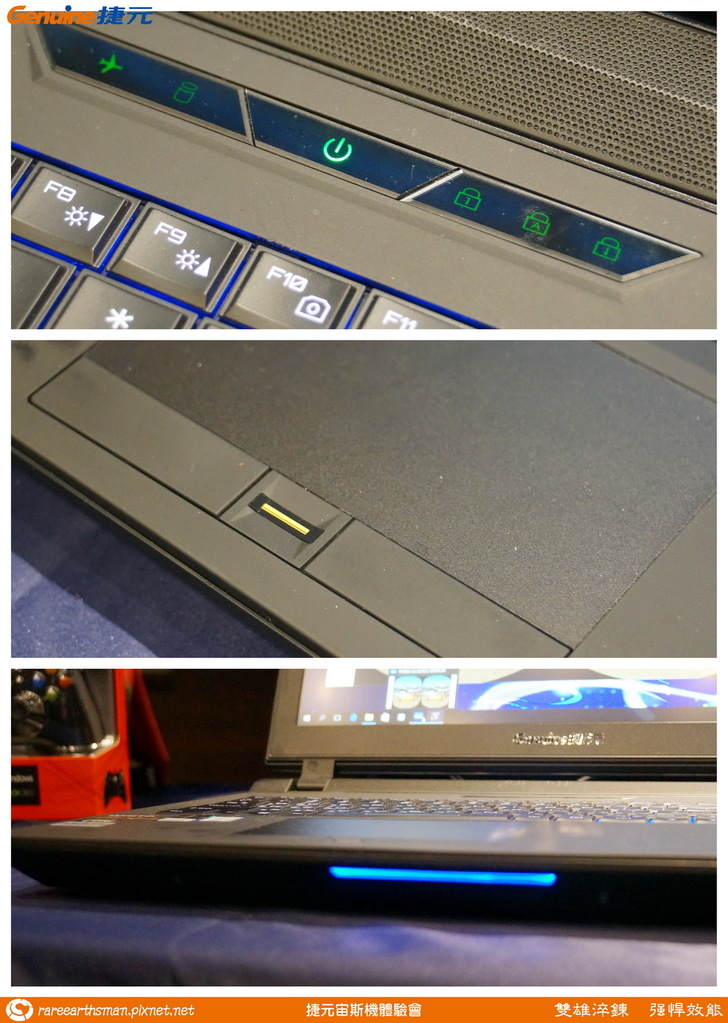 ▲ZEUS15鍵盤上方的電源鍵與指示燈設計的跟ZEUS17不大一樣,ZEUS15設計的比較直條狀;觸控板也同樣具有多點觸控與 Windows 8.1 手勢操作功能,下方採用雙按鍵設計,中央同樣配置了指紋辨識器;電腦下方設計了藍色條狀的狀態燈。