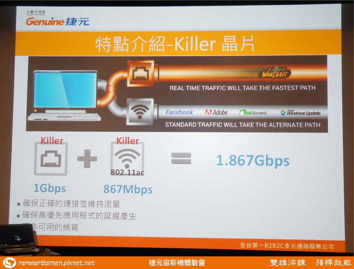▲以往有線網路與無線網路是互相不支援的,除了各自使用各自的頻寬之外,也只能選擇單一的網路來源,但是Killer晶片的優點是可以將有線與無線的頻寬給加總起來來維持與穩定流量,而且可以個別設定個個應用程式的優先權,以確保某些遊戲或程式可以擁有完整的網路支援。