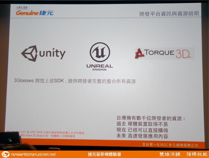 ▲3Glasses的SDK現只支援Windows的系統,對應Unity引擎4.6 &5.3兩個版本,Unreal引擎支援4.10以上版本,這兩種引擎都須搭配SDK裡面的管理平台運作。