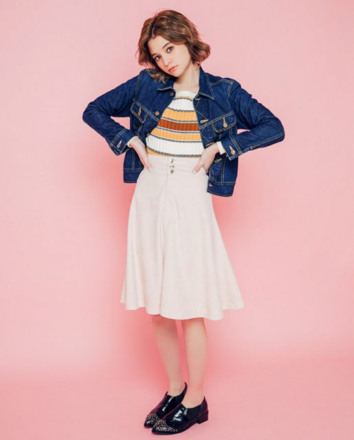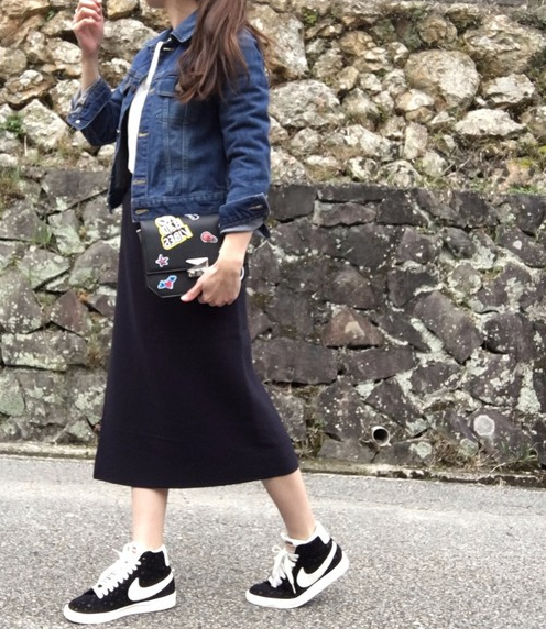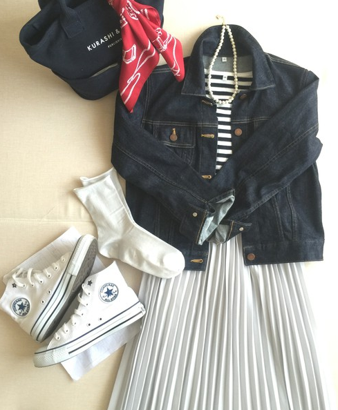 深色硬質地的牛仔外套,加上最近從原宿開始發燒的白色百褶裙。