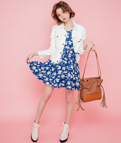 小碎花連衣裙和牛仔外套混搭在一起,在配件的顏色上做點小巧思。