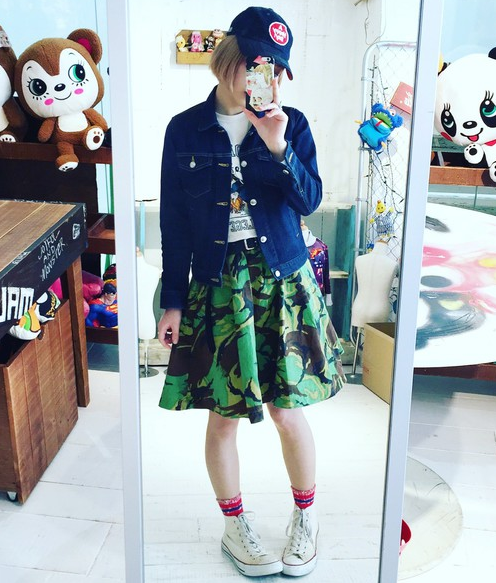 單寧外套、質感絨布的鴨舌帽和美式T恤有點帥氣,重點則放在迷彩圖案的裙子,不會太過酷炫,反而多了分俏皮感。