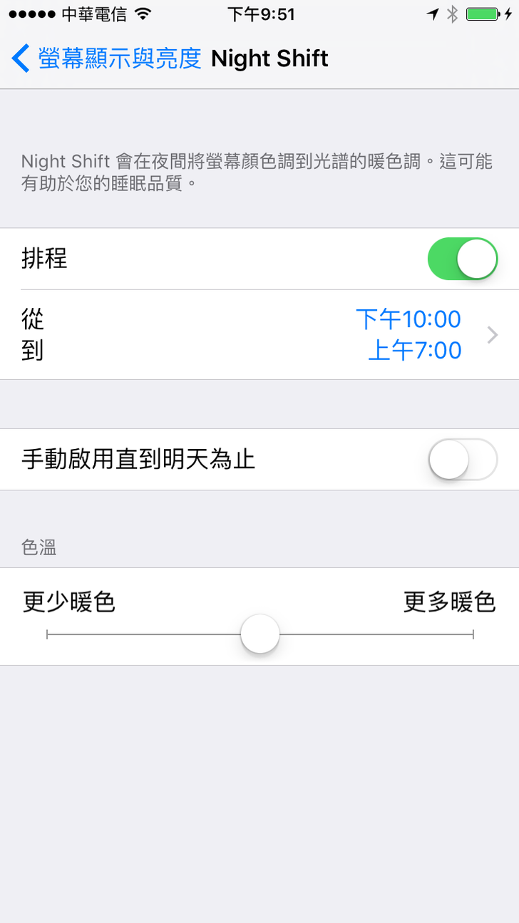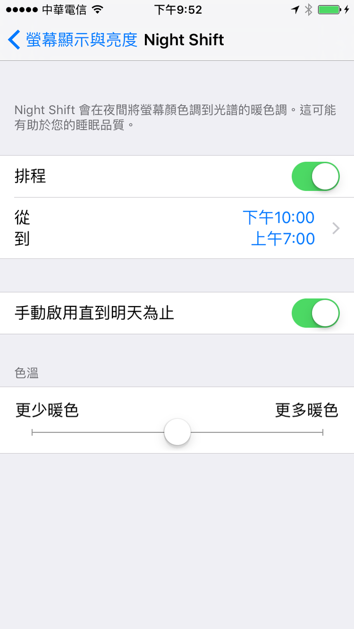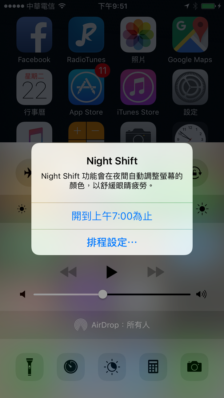 您的iPhone更新到iOS 9.3了沒? 好用的"Night Shift"功能可以保護我們的眼睛喔!!! 升級到iOS 9.3後,往上拉出快捷列,中央就會出現像圖一的 "月亮太陽" Logo 系統允許我們自動排程每天要執行的時段,以及螢幕的色溫強弱,機本上更多色溫的結果就會越舒適,可以自由手動調整 當然也可以強制手動立刻執行Night Shift功能,馬上進入類似"防藍光"的效果,此時螢幕就會顯得比較偏黃 講了那麼多,大家趕快來升級玩玩吧!!! 讚 收藏 快速回應 引言回應
