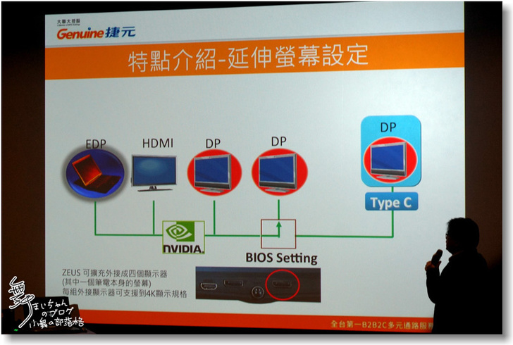 ▲而在宙斯電競主機上也都支援了多螢幕的電競輸出,而 ZEUS17還可以支援到三個螢幕,利用HDNI和2個Display Port;但在第六代的機器上還可以透過BIOS的調整來把Type C槽轉換成螢幕輸出。