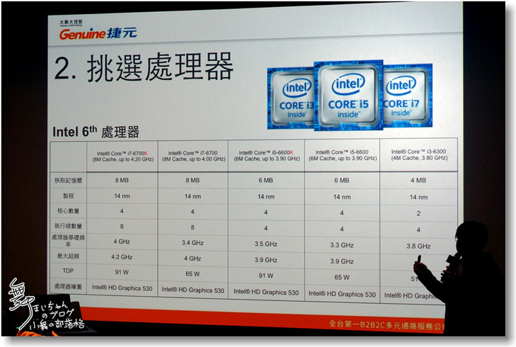 ▲接就就是選擇處器,INTEL也在去年發表了第六代的處理器,大家可以像往常選擇i3、i5或i7處理器,而在i3和i5處理器如果型號上有k字樣,代表還能超頻,壓出更多效能。