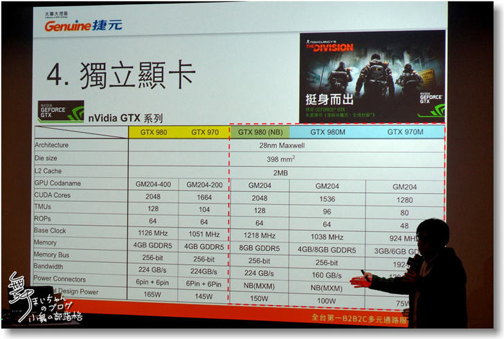 ▲第四就是大家很重視的獨顯規格,好的顯卡能夠帶來更佳的電競體驗,如桌機會使用的GTX970/980,以及筆電用的GTX970M/980M/980NB等等。