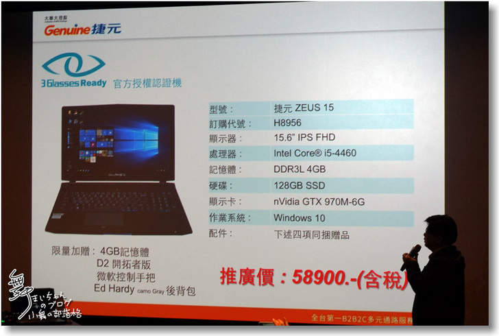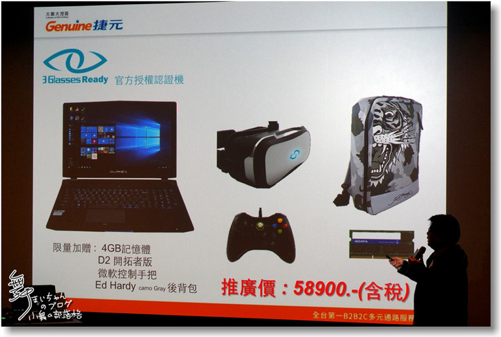 ▲組合中包含ZEUS15主機、 3Glasses D2、額外4GB記憶體、微軟手把和Ed Hardy後背包,真是物超所值呀。因為時間的關係,范經理的介紹就到這邊了。