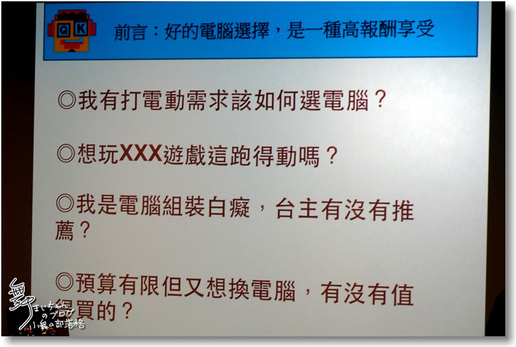 ▲QK一開始就介紹自己有25年的電玩歷史,所以誠心推薦,有一部好的電腦選擇,是一種高報酬的享受。而這也透過幾個問題來驗證:
