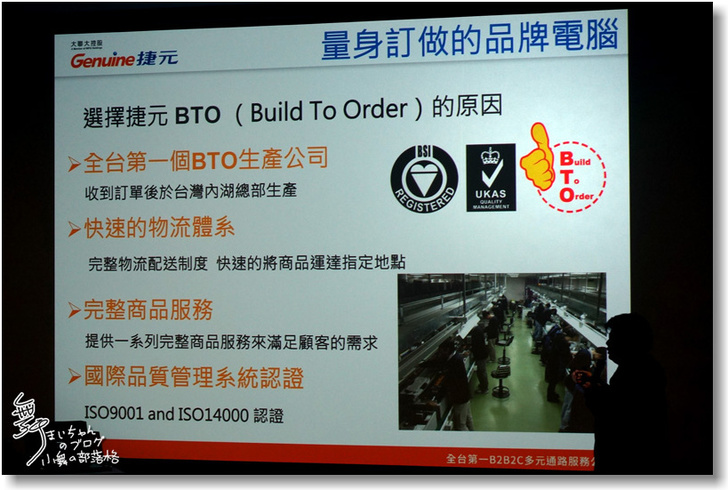 ▲針對BTO量身訂做,范經理也透過這張投影片詳細說明,這也是捷元在內湖的生產線,捷元本身擁有代理商品的資源,能提供一系列完整的商品服務,就算只有一台也能客制化。