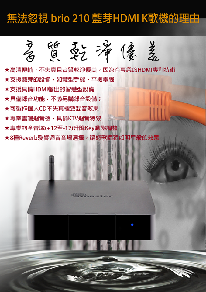 若您也跟我喜歡觀賞電影或音樂歌曲,講究原音高音質的音場表現,注重真實原音的環繞效果,或您想要的是一種又可看電影、看演唱會、甚至打電動專用的音效設備,brio 210藍芽HDMI K歌機加購魔力棒,魔力棒的特製音效帶來無比樂趣,具備變音功能,可將遊戲或電影之音效作3D殘響擴展,創造身歷其境效果。若您是要練唱或唱歌,想將美好的聲音錄音,brio 210 藍芽HDMI K歌機,採用CD等級高音質錄音,也可直接錄音,替您省下去專業錄音室或購置錄音設備 。擁有獨家專利技術,可將 MP3 / MV 的人聲直接濾除約60%至80%,剩下的隱約人聲作為導唱,是您練唱和唱歌的好幫手。