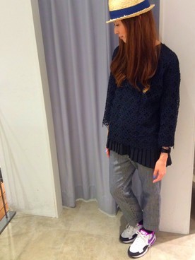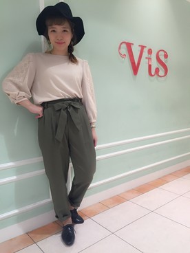 米粉色的蕾絲上衣搭上高腰鬆緊寬褲,稍微有點尖頭的皮鞋和修飾整體視覺感的軟呢帽。有種像是韓系的風格,卻不會太過少女,穿著恰到好處。