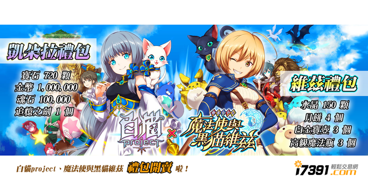 【白貓project X 魔法使與黑貓維茲】 禮包出爐! 白貓project 禮包內容有: 寶石720顆、金幣100萬、魂石10萬、追憶之劍1個 魔法使與黑貓維茲 禮包內容有: 水晶150顆、月餅4個、白金寶壺3個、高級魔法瓶3個 白貓project禮包點我 魔法使與黑貓維茲禮包點我 讚 收藏 快速回應 引言回應