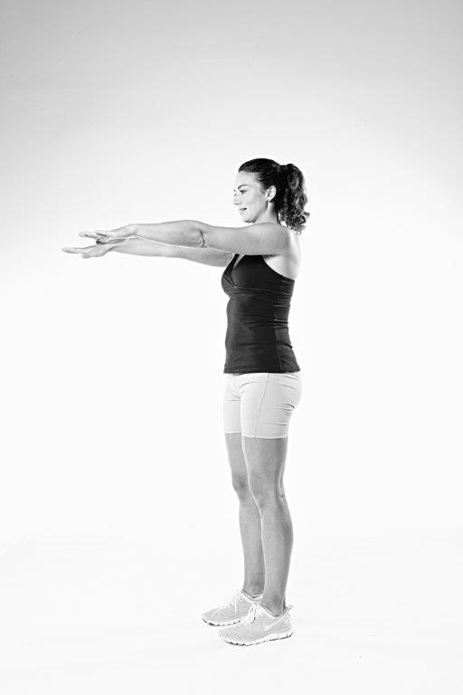 挺胸直立,雙足與髖同寬,雙臂向前伸直,腳趾朝向正前方。接著彎曲雙膝,臀部往後移。過程中上半身盡可能挺直,雙膝向外壓,莫讓雙膝靠攏。如果上半身會微微向前移動,切勿讓上半身彎曲。如果柔軟度夠,就盡可能往下蹲,直到臀部碰到小腿肚(過程中切勿讓脊椎彎曲)。在脊椎彎曲前倒轉動作,利用腳跟及臀部肌肉的力量將自己向上撐起,直到恢復挺直站立。如有必要,在重複動作前先調整雙足和上半身的位置。