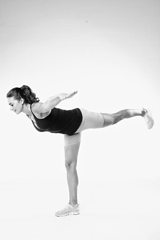 這個練習有助於形塑小腿、大腿背面、臀部和背部等部位肌肉,我們挺直站立時需要這些肌肉。這項練習可以明顯改善妳的平衡與體態。剛開始練習時或許難以保持平衡,不過妳很快就會進步。