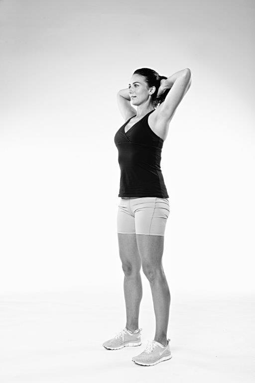 挺胸直立,雙足與髖同寬,腳趾朝向正前方。雙手置於後腦杓,手指輕輕交叉,兩個手肘分別朝向左右兩邊。然後彎曲雙膝,臀部往後移。過程中上半身盡可能挺直,雙膝向外壓,莫讓雙膝靠攏。如果上半身會微微向前移動,切勿讓上半身彎曲。此外要繃緊肩胛骨之間的肌肉,讓手肘與兩耳齊高。如果柔軟度夠,就盡可能往下蹲,直到臀部碰到小腿肚(過程中切勿讓脊椎彎曲)。在脊椎彎曲前倒轉動作,利用腳跟及臀部肌肉的力量將自己向上撐起,直到恢復挺直站立。如有必要,在重複動作前先調整雙足和上半身的位置。