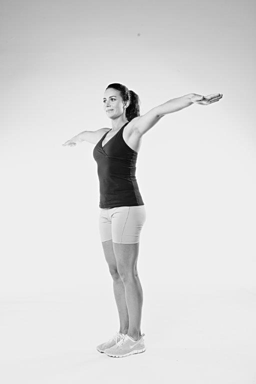 直立站好,雙臂伸向兩側與上半身形成T字形。接著左腿盡可能往後方抬高,上半身往前方下降,直到上半身和左腿與地面平行,身體從頭到左腳跟呈一直線。萬一身體還不夠靈活,無法讓上半身和腿部與地面保持平行,但是站立那條腿的大腿背面已有明顯的拉伸感覺,這時可以稍微調整姿勢。接著,雙臂和肩膀形成的T字向左旋轉,然後回復水平狀態(動作時切勿移動頭部和髖部)。請注意,練習中腳趾要維持同樣的姿勢,髖部與肩膀保持穩定。最後回復起始姿勢,然後換另一邊做同樣的練習:將右腿抬高,T字向右旋轉。