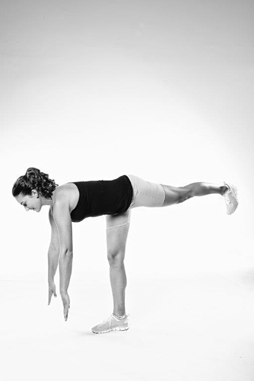 直立站好,雙臂向前伸直。接著左腿盡可能往後方抬高,上半身往前方下降,直到上半身和左腿與地面平行,身體從頭到左腳跟呈一直線。萬一身體還不夠靈活,無法讓上半身和腿部與地面保持平行,但是站立那條腿的大腿背面已有明顯的拉伸感覺,這時就可以回復站立姿勢。請注意,練習中腳趾與雙臂要維持同樣姿勢,髖部與肩膀保持穩定。動作完成後換另一邊做同樣的練習。