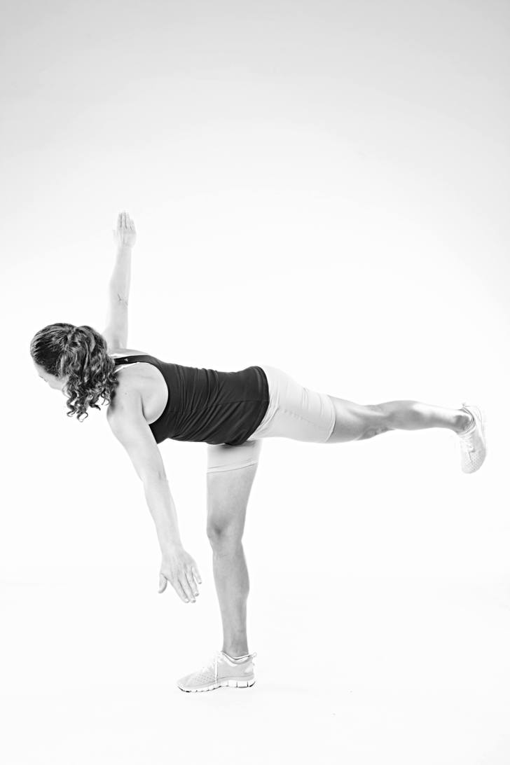 直立站好,雙臂伸向兩側與上半身形成T字形。接著左腿盡可能往後方抬高,上半身往前方下降,直到上半身和左腿與地面平行,身體從頭到左腳跟呈一直線。萬一身體還不夠靈活,無法讓上半身和腿部與地面保持平行,但是站立那條腿的大腿背面已有明顯的拉伸感覺,這時就可以回復站立姿勢。請注意,練習中腳趾與雙臂要維持同樣姿勢,髖部與肩膀保持穩定。動作完成後換另一邊做同樣的練習。