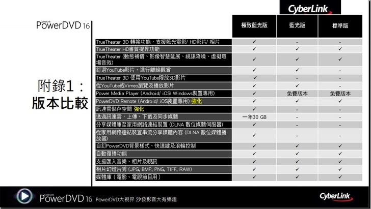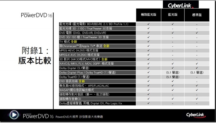 有 PowerDVD 16 藍光版 PowerDVD 16 標準版...數位下載版,在功能上會有