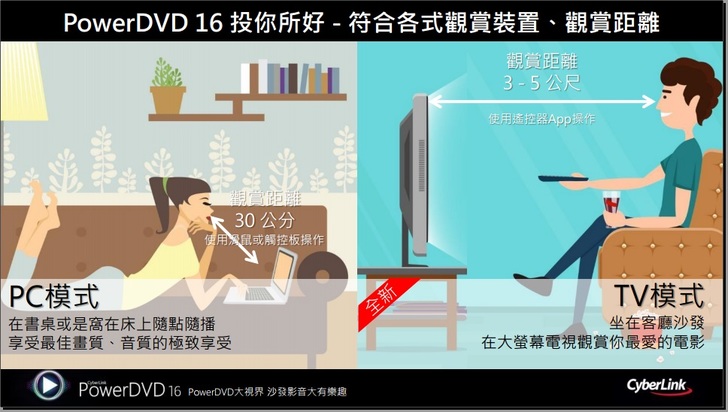 TV 模式 是 PowerDVD 16 新的播放模式,適合距離 3~5 公尺觀賞的大螢幕