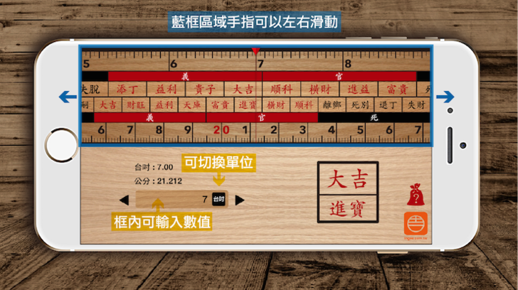 「魯班尺」App囊括了這2種尺。尺標設計亦同於坊間習慣的方式,另外,在畫面右下黑色方格中會依據目前尺寸顯示相應的字。