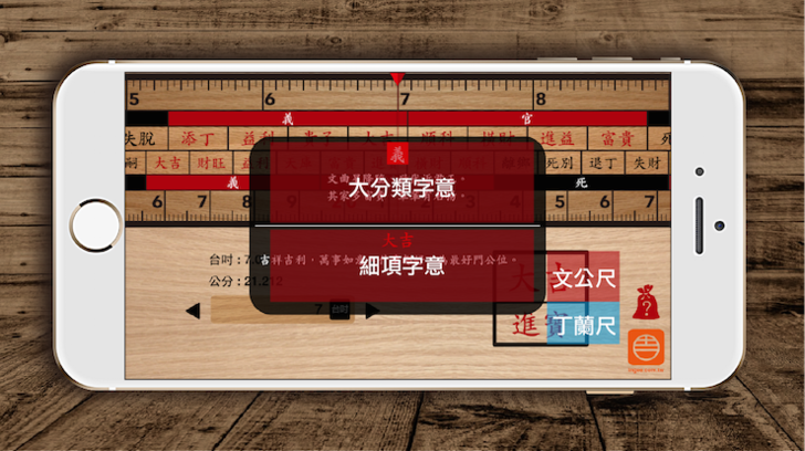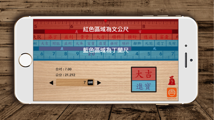「魯班尺」App囊括了這2種尺。尺標設計亦同於坊間習慣的方式,另外,在畫面右下黑色方格中會依據目前尺寸顯示相應的字。