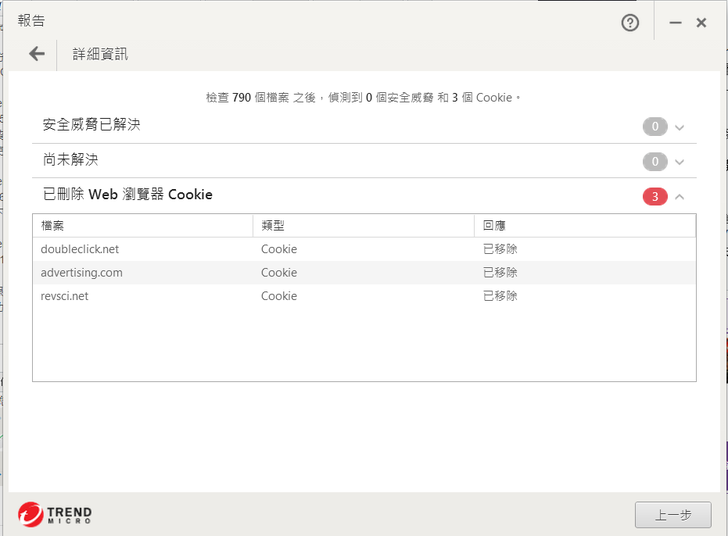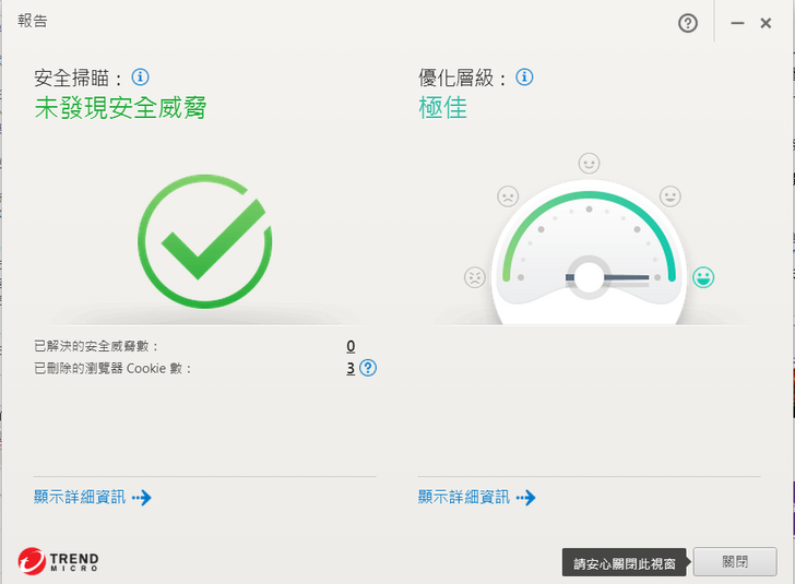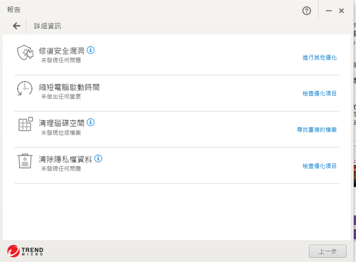 掃瞄完後,呈現的說明也是易懂,我覺得PC-cillin防毒軟體,有一個功能我很愛,就是電腦優化的功能,這個對於電腦不是很拿手的使用者,真的很好用,只要優化後,電腦就會比較快一點,這是我原本購買此套防毒軟體時沒有想過的功能。