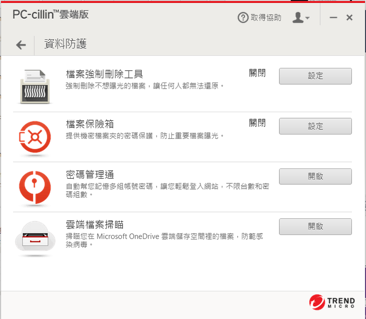 優點:因為我本身就是使用PC-cillin防毒軟體趨勢大神,我覺得對於不懂電腦的使用者,PC-cillin防毒軟體趨勢大神真的有很完整的防毒功能,它的四大功能【防護設定】【隱私安全】【資料防護】【家長防護】操作上簡單易懂,說明也很清楚,而它的【旗艦服務】,更是很多不懂電腦的夢寐以求的服務。PC-cillin防毒軟體真的是趨勢大神。