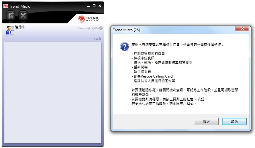 ▲ 趨勢大神發送的遠端控制程式的生命週期只有30分鐘,超過時間須再接受新的安裝程式檔,而且每隻程式只有一次執行的機會,採用無安裝痕跡的執行方式,程式到期後便自動自我刪除,不需要再進行移除的動作,此類兼顧操作便利性與使用安全性的方式,筆者不僅僅是第一次看到,還深深地感到佩服。