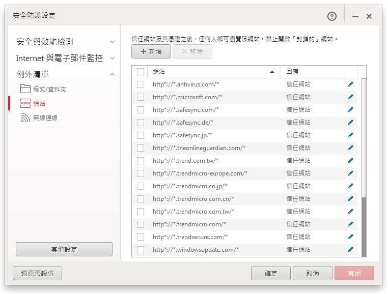 ▲ 在[防護設定]→[安全設定]→[例外清單]→[網站]中,可以新增受信任的網站,趨勢科技已經添增了許多安全性的網站。